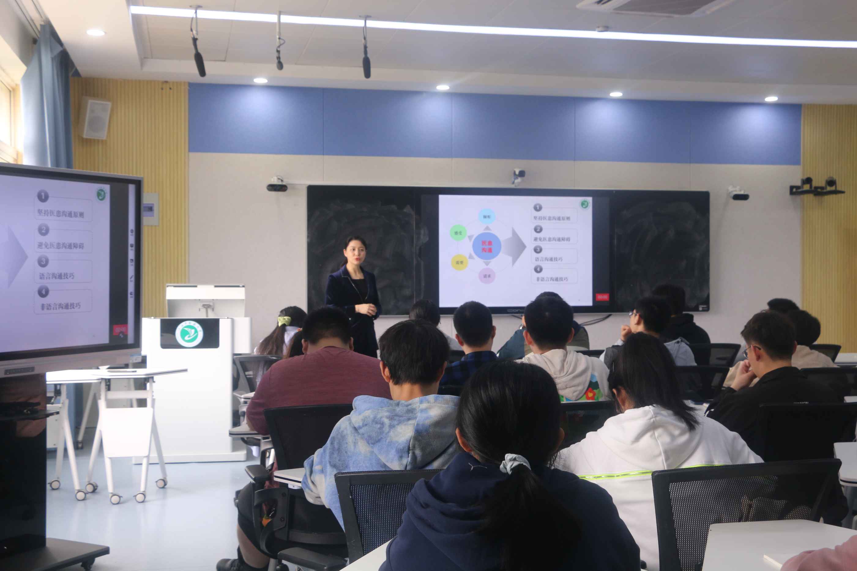 讲座中,叶菁副教授结合自身临床经验,向在座的同学们分享了多例经典医患沟通范例,让同学们深入了解到了习医之人应当在有限的沟通中获得更多有效的信息,从语言交流中给予患者安慰,减轻患者心理负担。关于如何提升医学生职业素养问题,叶菁副教授从医德基本修养和医德基本规范两方面做出详细解答。讲座最后叶菁副教授根据自身从医经历,论述了团队协作对日常工作的重要性,进一步加强了同学们对医学职业素养的认识。
