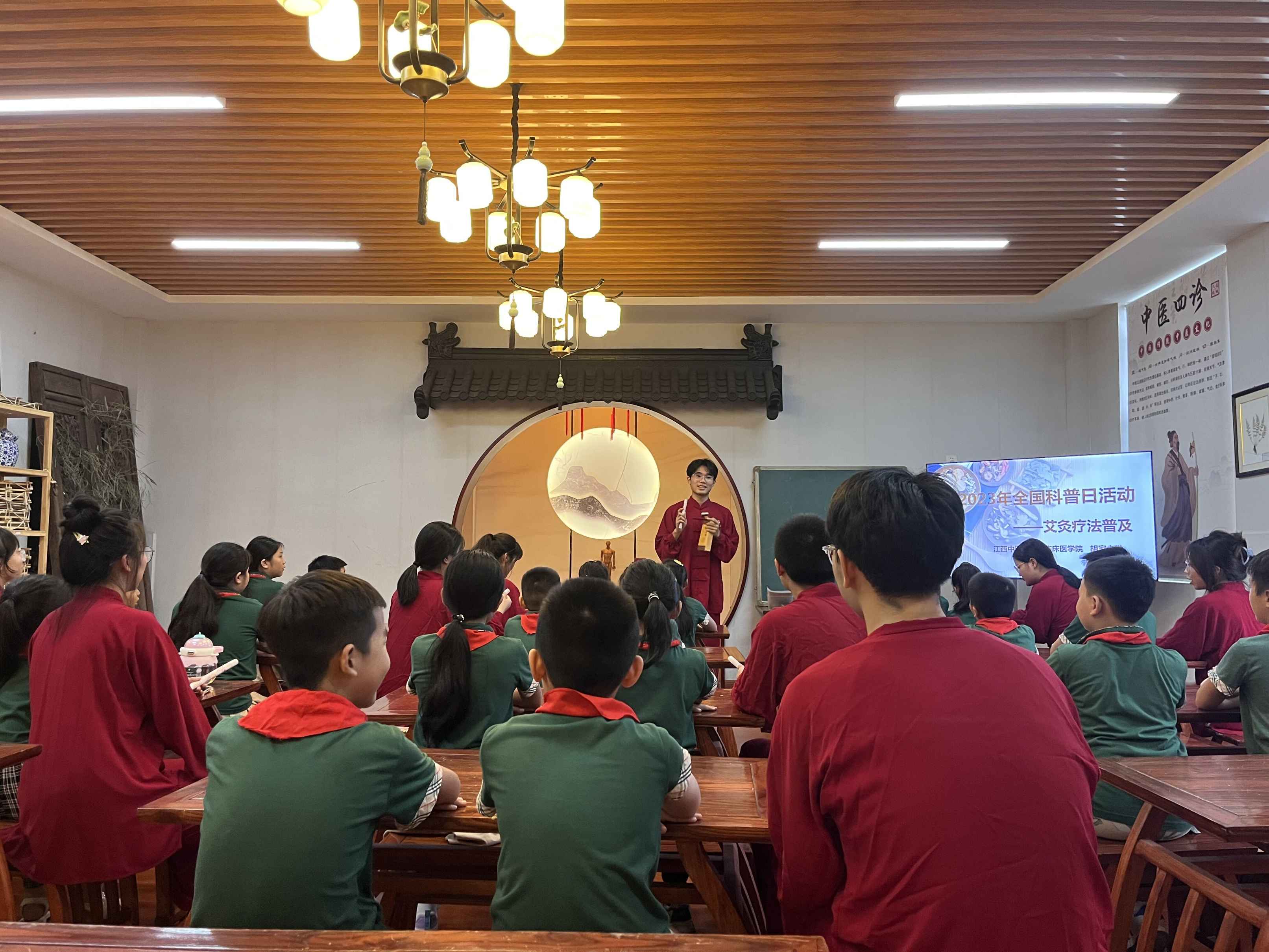 此外,支部学生党员在胡家小学标本馆内向小朋友们普及艾灸疗法知识并展示艾条的使用,以通俗易懂的话语介绍“一柱着肤疼痛及止,一次施灸沉疴立除”的神奇功效。面对小朋友们提出的诸多问题,支部党员耐心解答,带领他们亲身体验艾灸疗法的趣味与奇妙。
