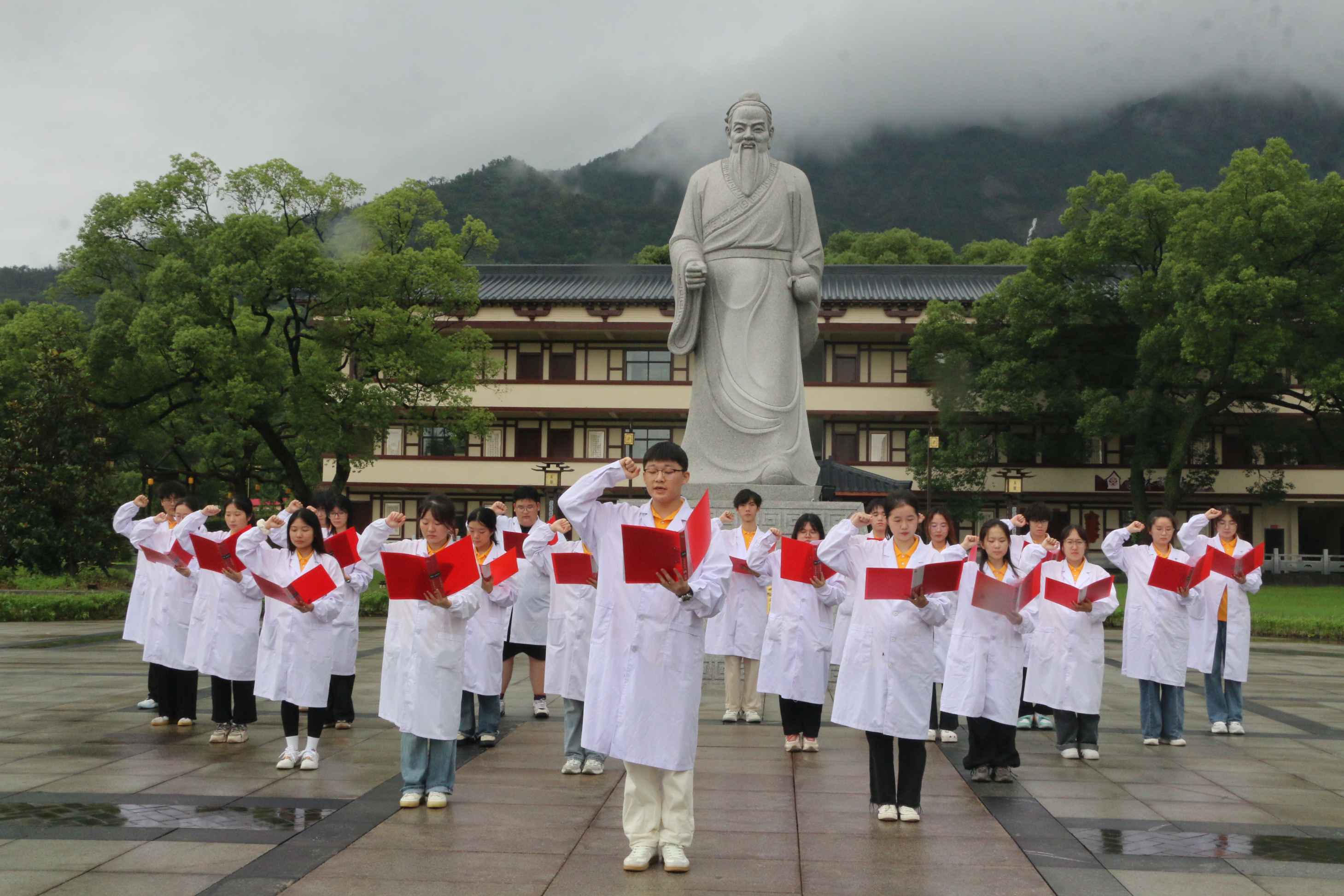 “健康所系,性命相托。当我步入神圣医学学府的时刻,谨庄严宣誓……”在杏林文化遗址的董奉雕像前,怀揣着对医学的敬意,实践队员们高举右拳宣誓,目光坚定,掷地有声。来到中华中医药学会授予庐山市政府的“杏林遗址”石碑旁,队员们昂首挺胸,神色庄重,齐声诵读《大医精诚》,用铮铮誓言传递出队员们甘于奉献,救死扶伤的坚定信念。