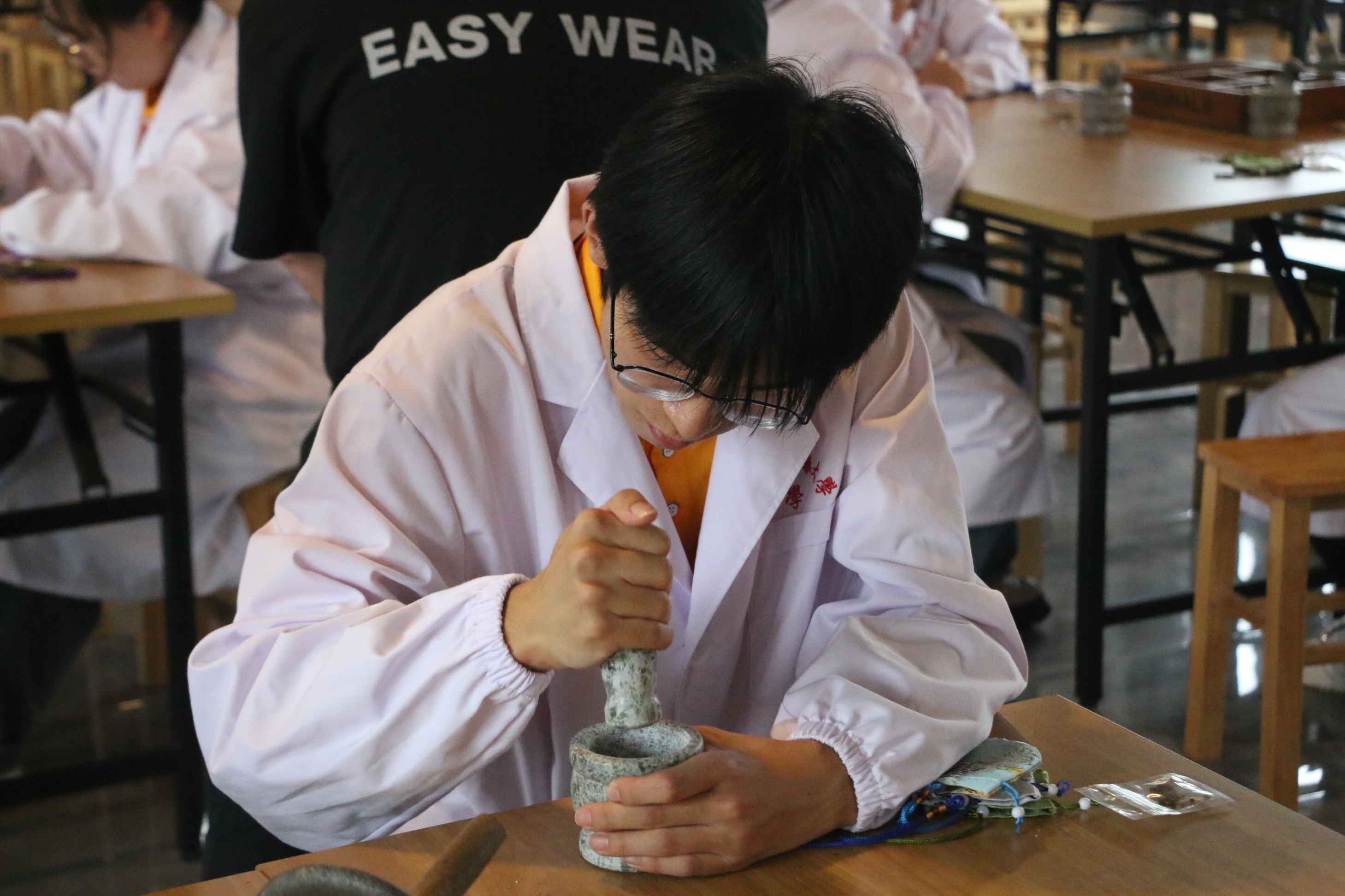 挑选药品,称量重量,研磨成粉……在研学教室,队员们体验了传统中药炮制工艺。中药炮制是中国医药传统制药技术的集中体现和核心,有增强药物疗效、改变药物性能等作用。队员们使用杵臼、碾船等传统中医药炮制工具,加入艾草、藿香等药物,将其捣碎、磨粉,制成具有驱虫、助眠功效的香囊留作纪念。