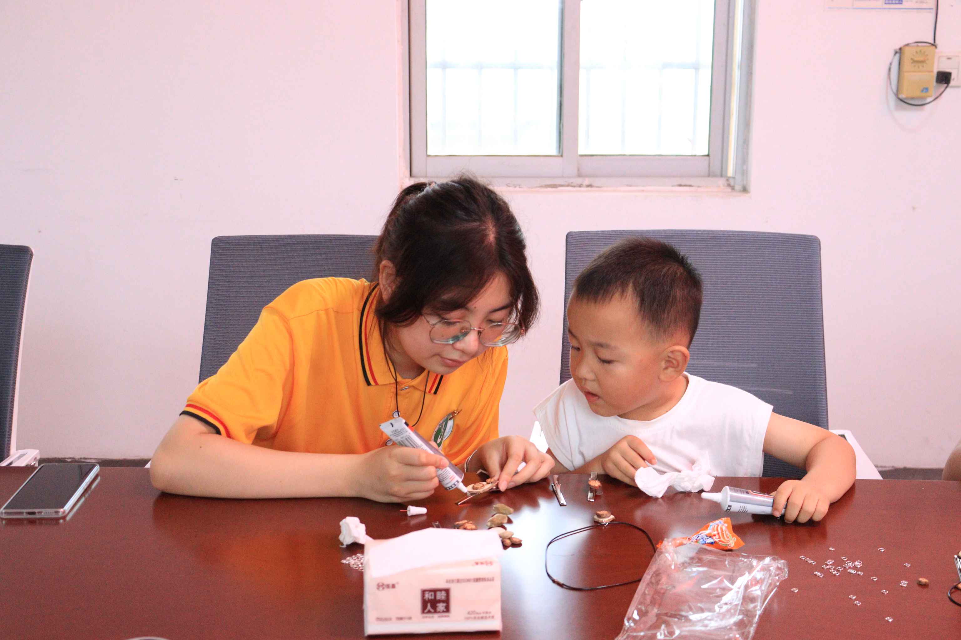“这个白色不规则的薄片叫做白芷,有时可以用来治疗感冒。”在二楼会议室,实践队员们一边为小朋友们分发材料,一边对每一种药材进行简单介绍。打孔、套环、穿线……一个简单的中药项链便完成了。小朋友们充满奇思妙想,将白术作为底盘,用胶水在其上面加上甘草、生地等其他药材,组成奇特的图案,在队员们的教导和帮助下,亲手做出了精美的手链和发夹。