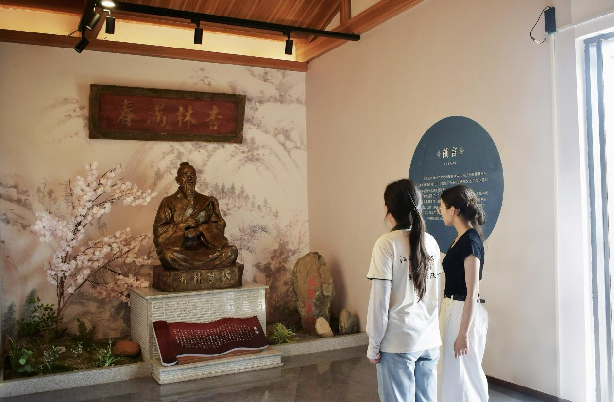 队员们行走在杏林遗址园内,斑驳的石碑上镌刻着历代医家的箴言,诉说着千年来中医药发展的历程。驻足在栩栩如生的董奉像前,怀着崇敬之心,聆听着关于董奉“杏林春暖”的典故,深刻感悟了大医精诚的真谛,也更加坚定了传承中医“仁心”的理念。