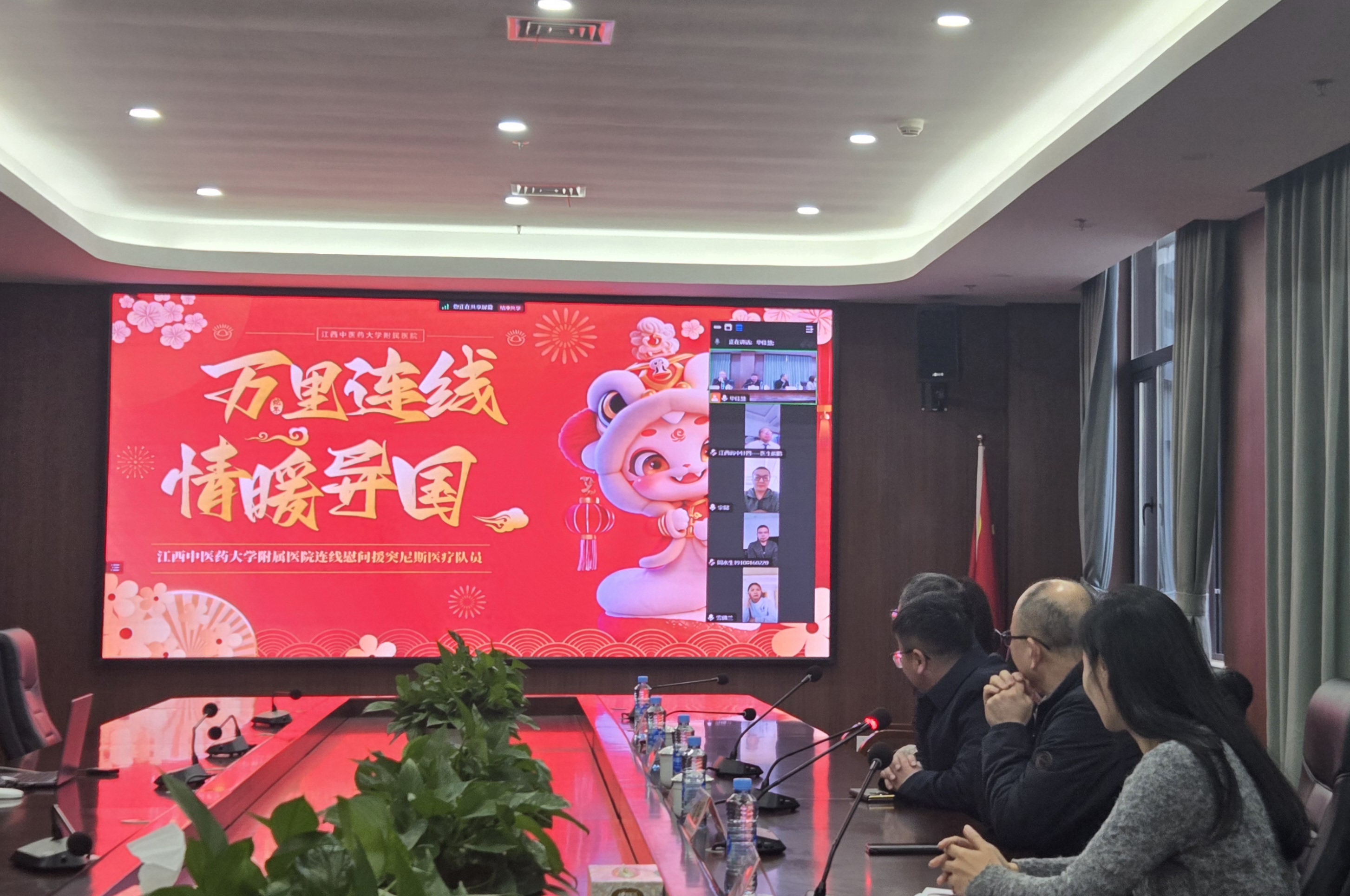 1月26日,一场特别的视频慰问在江西中医药大学附属医院西湖院区第一会议室举行。江西中医药大学党委委员、副校长,医院党委书记严小军,医院党委副书记、院长刘良徛,医院党委委员、副院长翁剑锋通过视频连线为远在突尼斯的宗懿、苏燕萍、熊鹏和周水生送去温暖的问候与新春的祝福。在交流中,领导们详细询问队员们初到突尼斯工作、生活这一个月以来的情况,了解他们在异国他乡的春节安排。