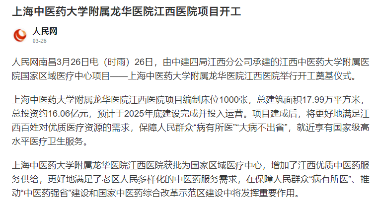 【人民网】上海中医药大学附属龙华医院江西医院项目开工