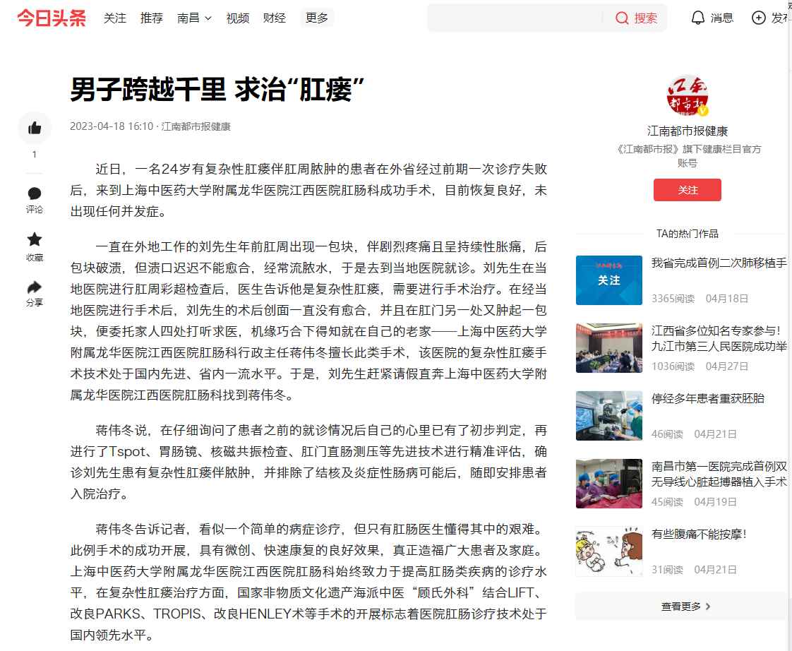 蒋伟冬告诉记者,看似一个简单的病症诊疗,但只有肛肠医生懂得其中的艰难。此例手术的成功开展,具有微创、快速康复的良好效果,真正造福广大患者及家庭。上海中医药大学附属龙华医院江西医院肛肠科始终致力于提高肛肠类疾病的诊疗水平,在复杂性肛瘘治疗方面,国家非物质文化遗产海派中医“顾氏外科”结合LIFT、改良PARKS、TROPIS、改良HENLEY术等手术的开展标志着医院肛肠诊疗技术处于国内领先水平。