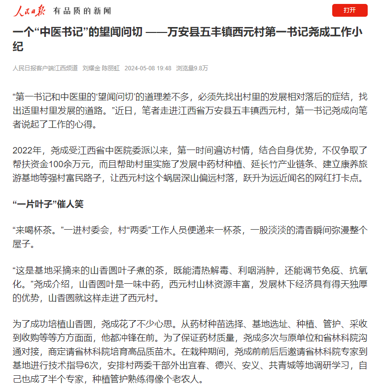 2022年,尧成受江西省中医院委派以来,第一时间遍访村情,结合自身优势,不仅争取了帮扶资金100余万元,而且帮助村里实施了发展中药材种植、延长竹产业链条、建立康养旅游基地等强村富民路子,让西元村这个蜗居深山偏远村落,跃升为远近闻名的网红打卡点。