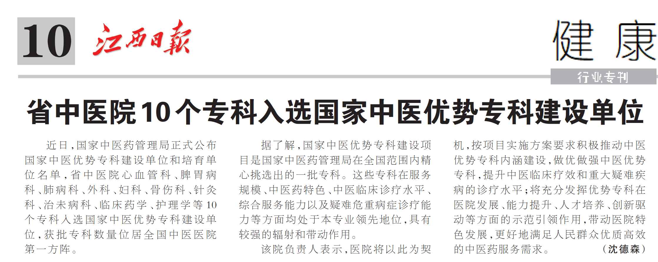 【江西日报】省中医院10个专科入选国家中医优势专科建设单位