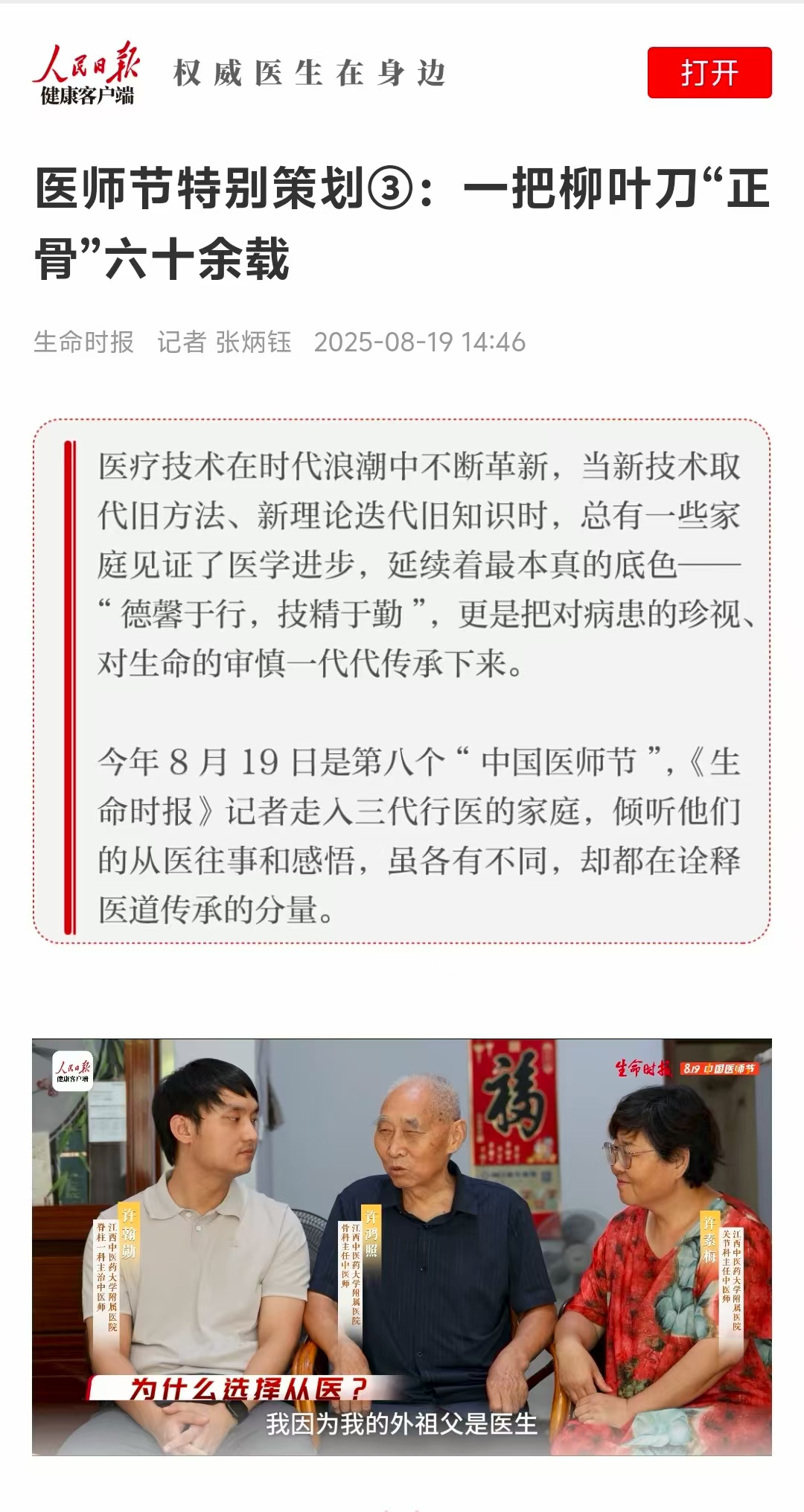 在江西中医药大学附属医院(又称江西省中医院、江西省骨伤医院),一个中医骨科世家书写着三代同堂的奉献篇章。86岁的许鸿照,作为该院骨伤科的创始人,退休后依然坚持出诊;女儿许素梅,在此倾尽了毕生的职业时光;如今,孙子许翰勋也接棒加入。祖孙三代以精湛医术与满腔热忱,共同守护着病患健康。
