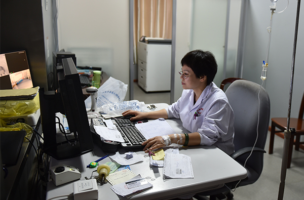 而涂瑞芳就是我院放射科核磁共振机房的一位主管技师。据了解,涂瑞芳现在在本院心血管科住院已经有十几天了,因为患有心肌缺血,所以每年都要住院两次进行治疗,每次住院得有一个多月才能完成治疗。“机房另一位同事也生病了,但这里的工作不能停下来,那么多病人都等着做检查呢!”涂瑞芳说:“上午我去住院部,护士给我配好药,挂上吊瓶我就过来了。你看,到现在还有病人在等着检查呢,不能耽搁他们的治疗呀。”虽然手背插着针头,但涂瑞芳手上的动作却在持续进行着。