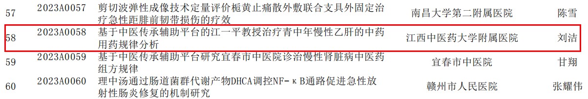 在最新公布的2023年江西中医药管理局科技计划一般项目名单中,工作室成员刘洁获得立项资助,她本次申报的课题为《基于中医传承辅助平台的江一平教授治疗中青年乙肝的中药用药规律分析》。