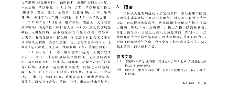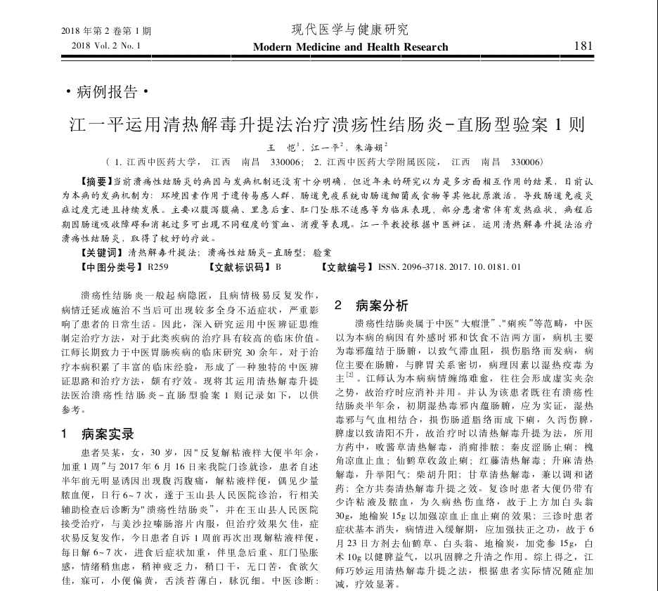 江一平运用清热解毒升提法治疗溃疡性结肠炎-直肠型验案1