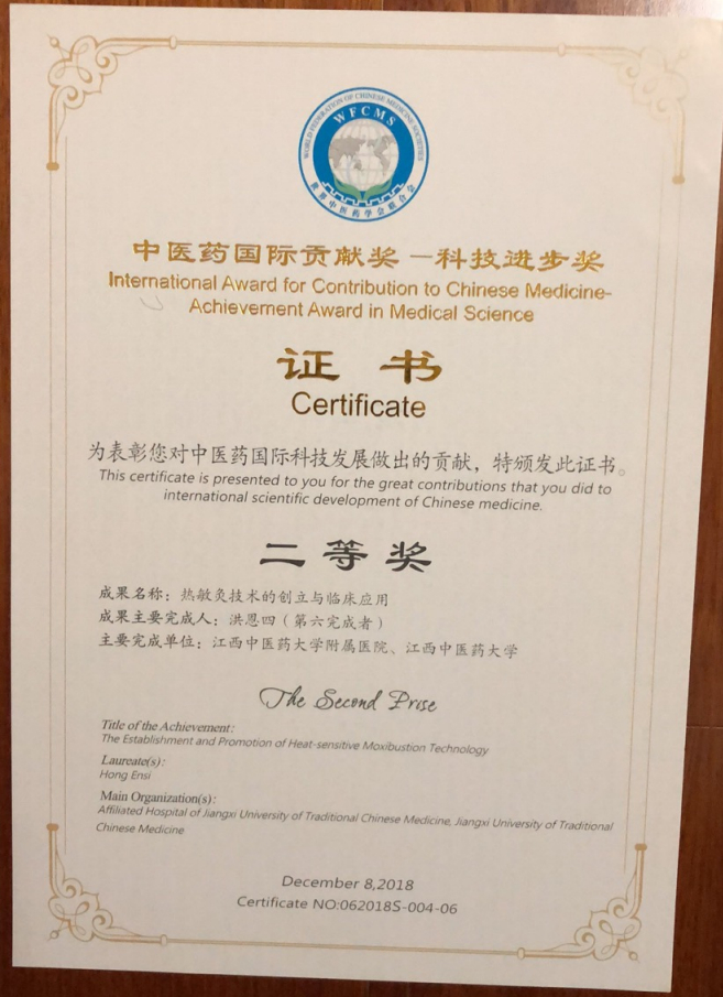 洪恩四奖项:2018年中医药国际贡献奖--科技进步二等奖