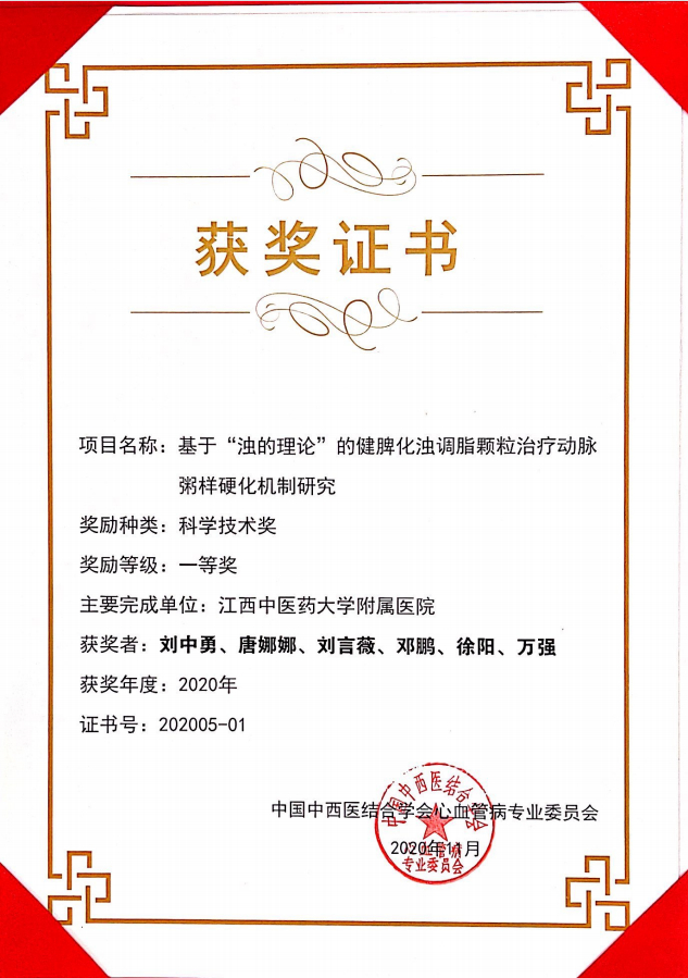 刘中勇团队:基于“浊的理论”的健脾化浊调脂颗粒治疗动脉粥样硬化机制研究中荣获科技技术一等奖 发布时间:2023-07-20点击次数:14837次 刘中勇团队:基于“浊的理论”的健脾化浊调脂颗粒治疗动脉粥样硬化机制研究中荣获科技技术一等奖