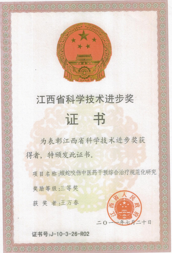 腹蛇咬伤中医药干预综合治疗规范化研究获省科学技术进步三等奖