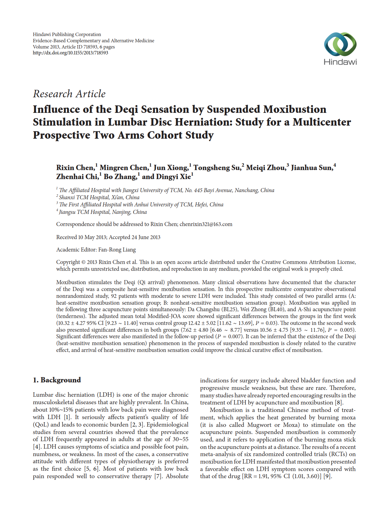 【学术】陈日新:Influence of the Deqi Sensation by Suspended Moxibustion Stimulation in Lumbar Disc Herniation: Study for a Multicenter Prospective Two Arms Cohort Study 发布时间:2021-09-03点击次数:9233次
