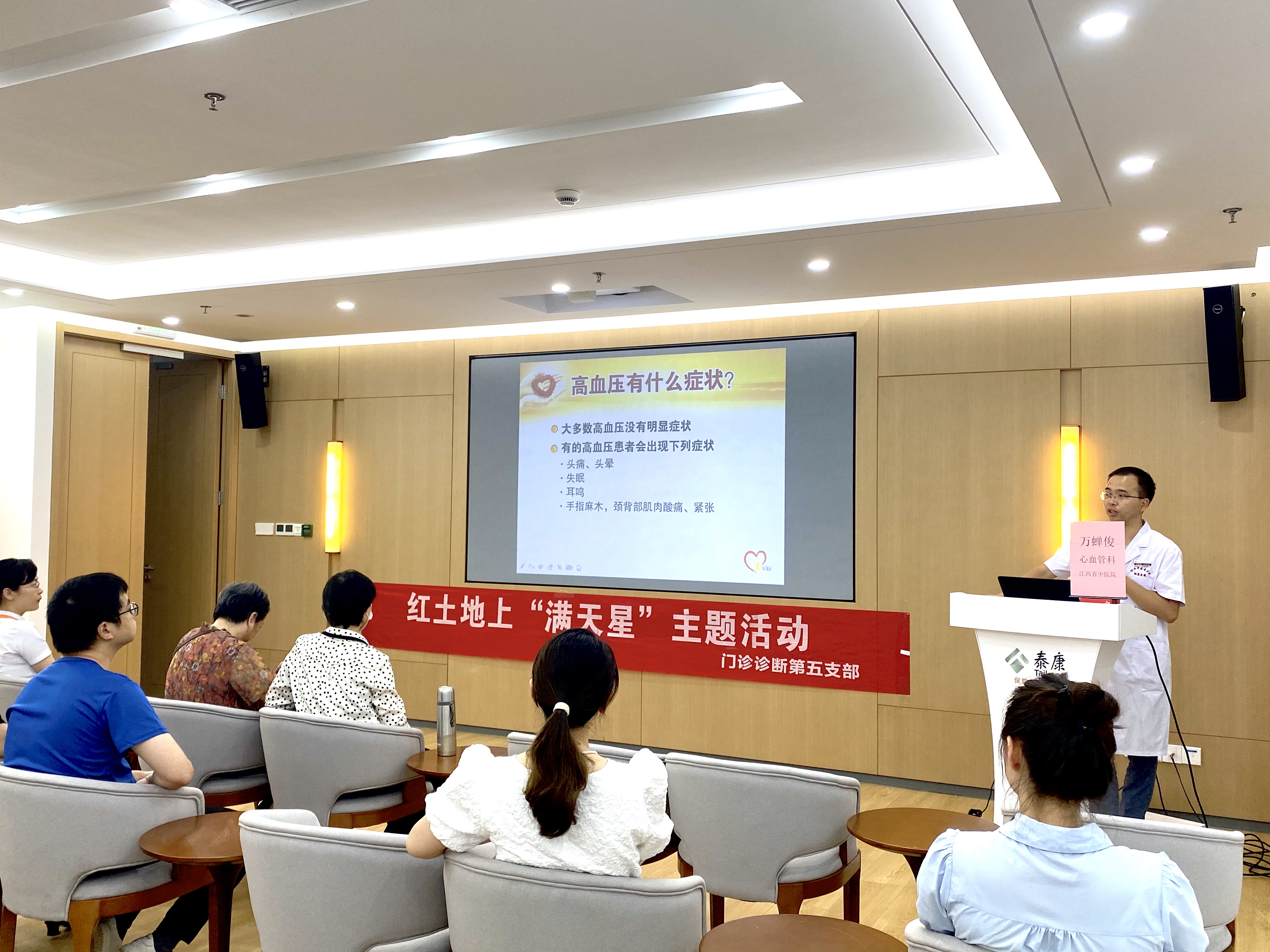 一心向党,共庆七一,喜迎二十大,医院掀起红土地上“满天星” 党建活动热潮。6月25日,门诊部前往泰康人寿保险有限公司江西分公司开展以“夏季养生之高血压”为主题的健康教育公益讲座。