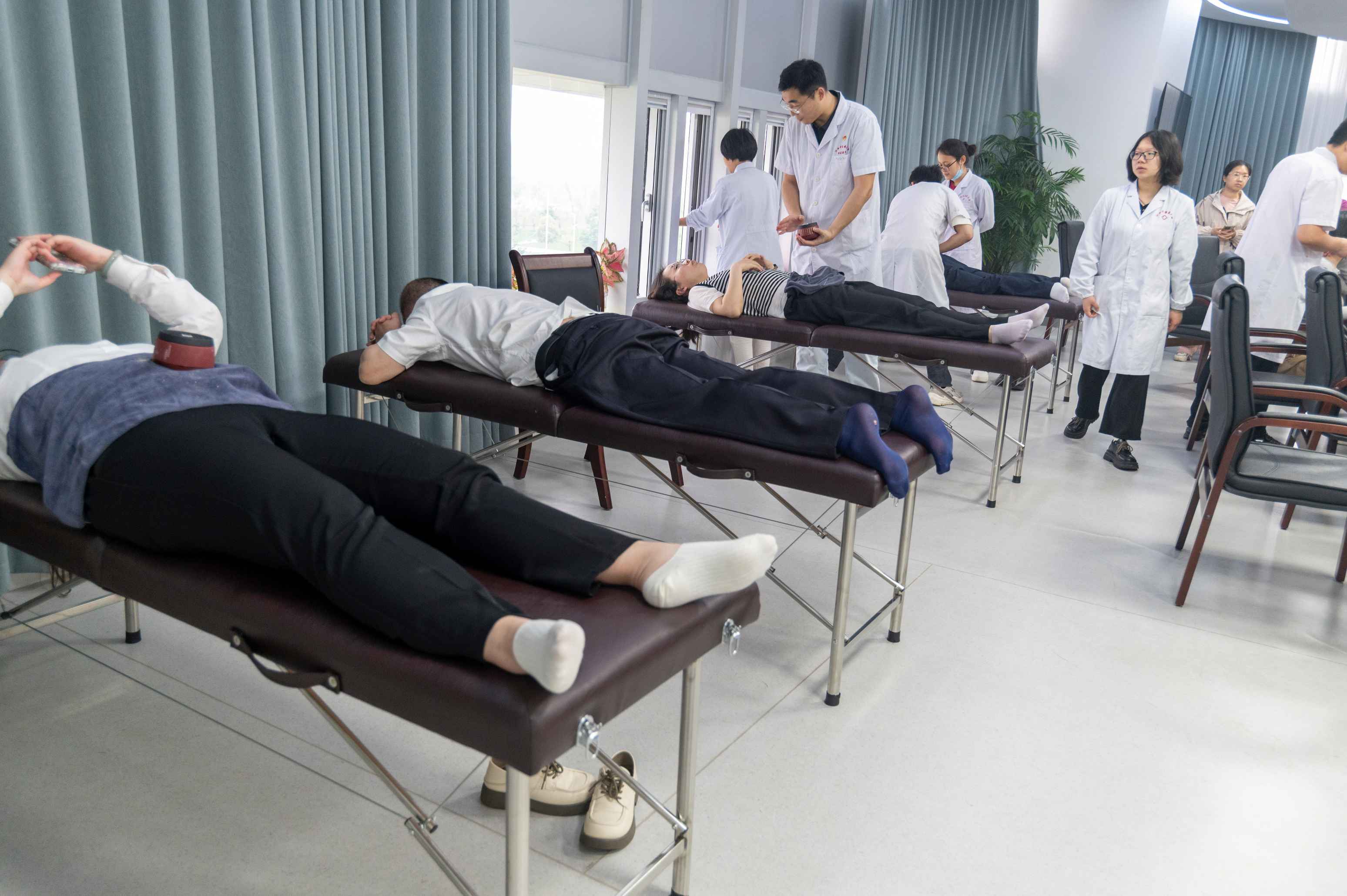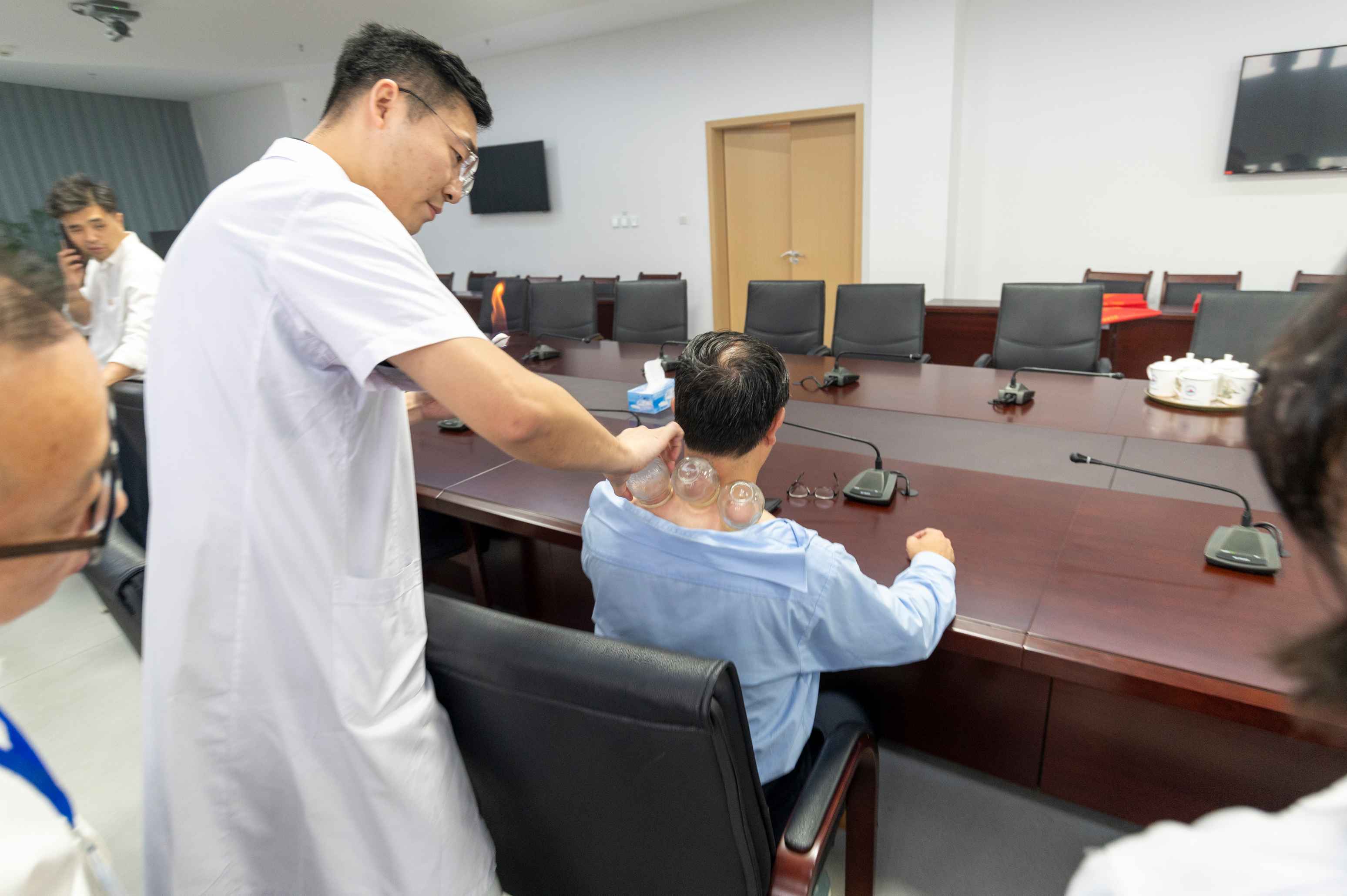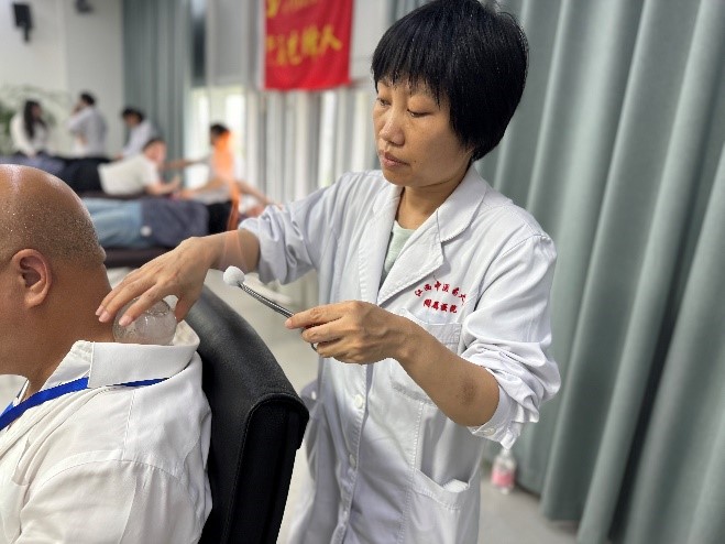 最后,医疗团队针对工作人员的体质,综合运用针灸、推拿、整脊、热敏灸、拔罐等中医特色疗法,让他们在深度体验中医操作的同时极大地缓解颈肩不适症状。