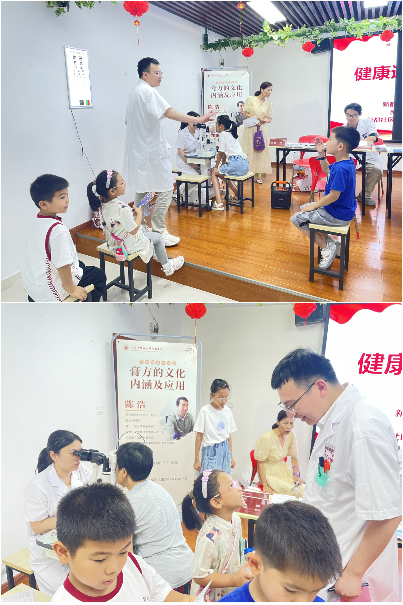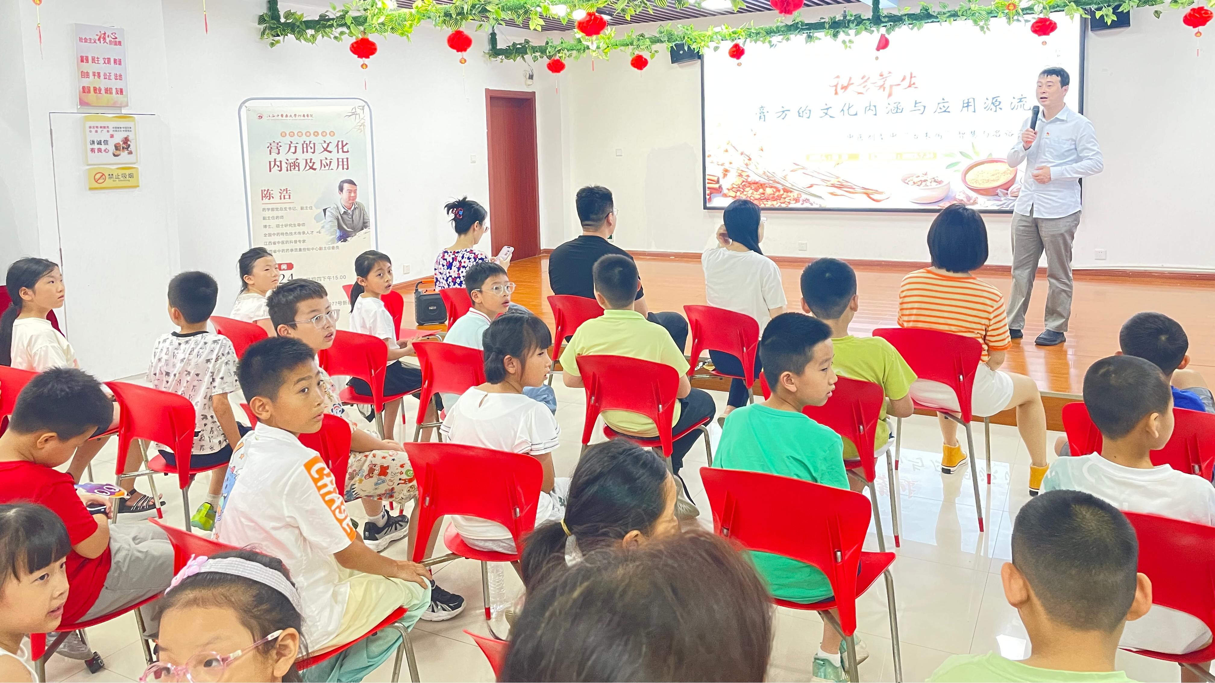 活动首先开展了百姓健康大讲堂,由我院药学部党总支书记陈浩副主任联合江西中医药大学药学院教工第二党支部万娜老师向社区居民作了《膏方的文化内涵与应用源流》主题讲座,深入浅出地介绍了膏方这一源远流长的中医特色的起源、发展及日常运用。令台下的居民们,尤其是小朋友们受益匪浅。
