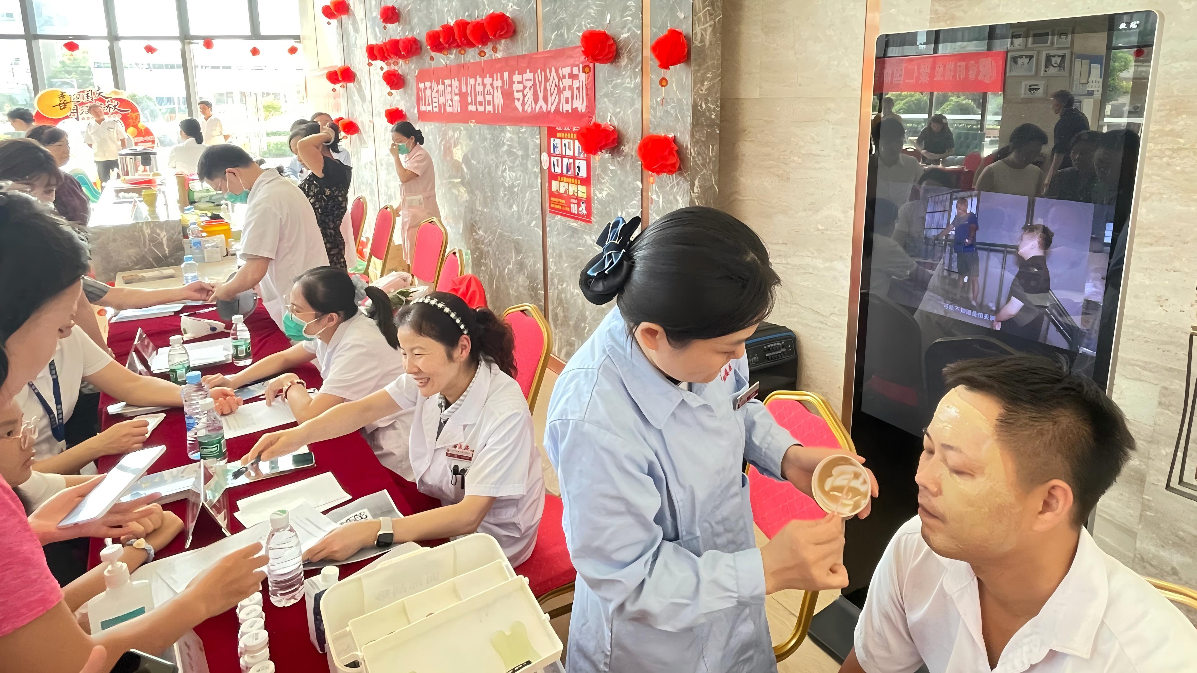 其中皮肤科派出梁育主任中医师和汤霞护士长组织团队,携带科室特色制剂(止痒酊、生发酊、土荆皮酊、四白散等),通过免费发放、现场体验的方式,展示美白祛斑和控油清痘等方面的中医特色治疗手段。引来社区居民争相体验。