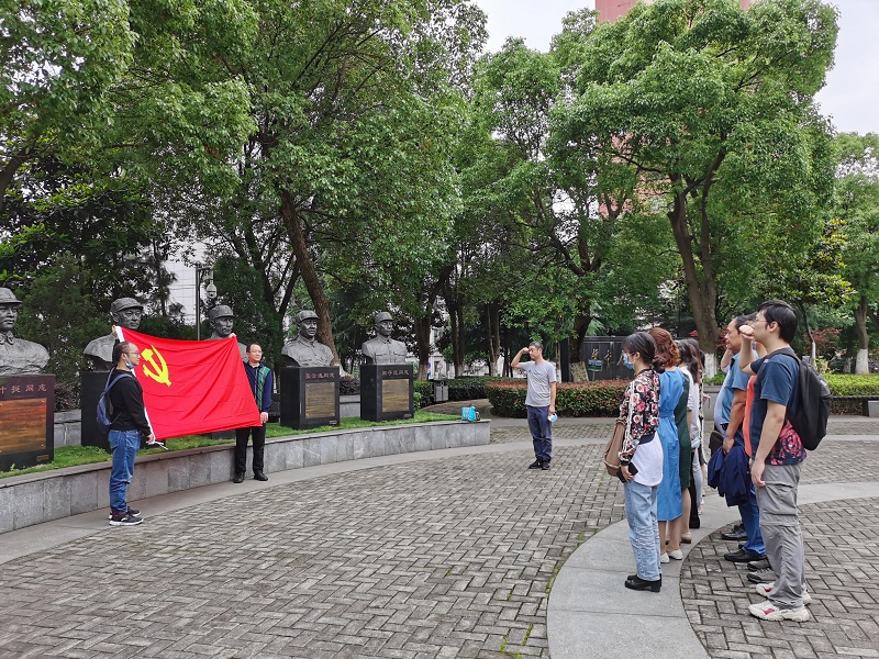 在到达新四军军部旧址陈列馆后,在支部书记姜浩的领誓下,面对鲜红的党旗,支部全体党员郑重地举起右手庄严宣誓,“我志愿加入中国共产党,拥护党的纲领,遵守党的章程……”,铿锵有力的宣誓声响彻整个纪念广场。