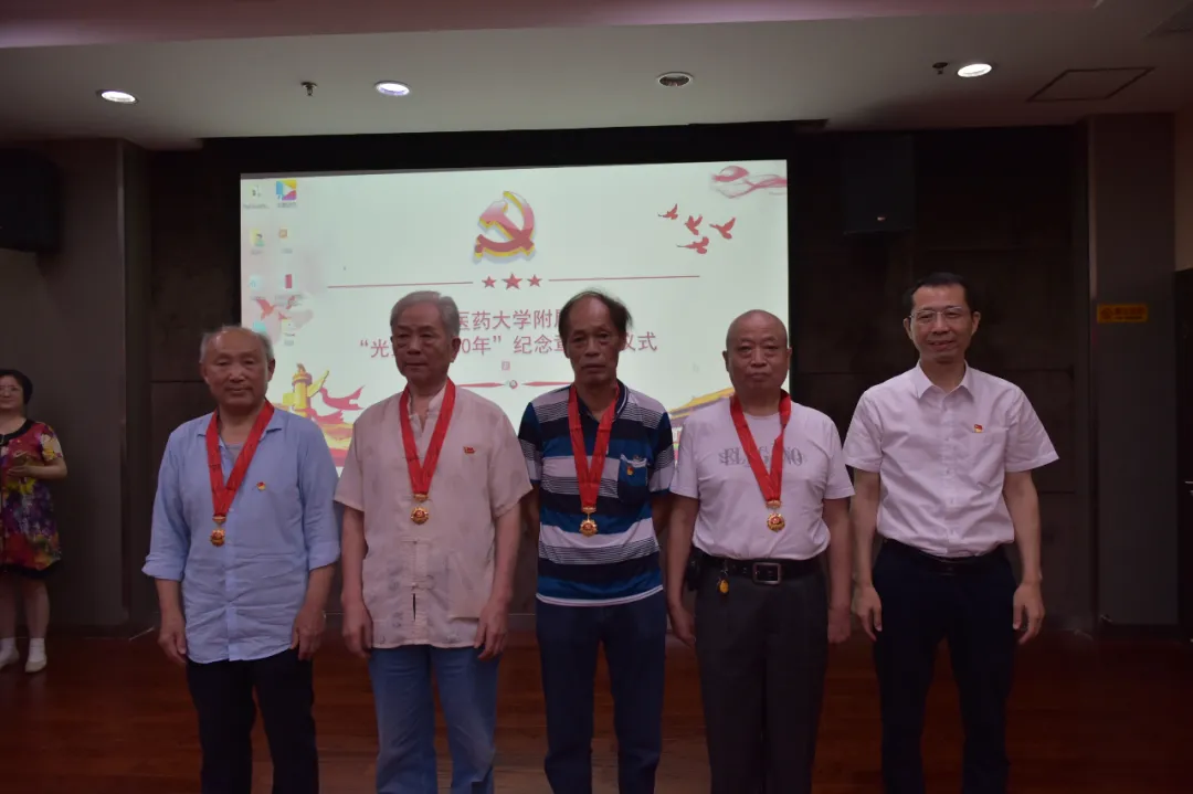 江西中医药大学党委委员、副校长、附属医院党委书记章德林一一为50年以上党龄的医院老党员颁发“光荣在党50年”纪念章。
