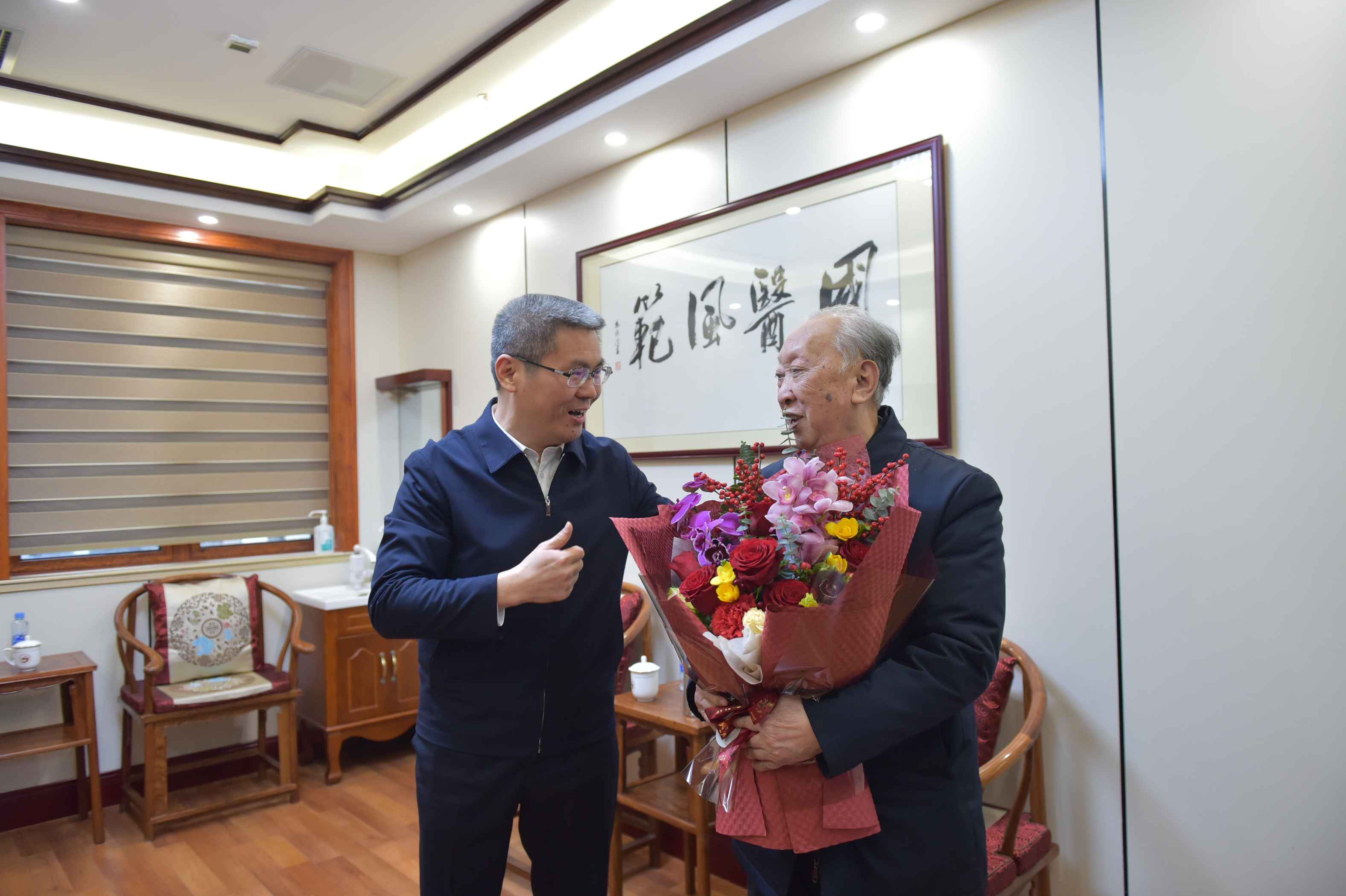 2025年3月,学校党委书记黄加文、校长朱卫丰看望慰问国医大师伍炳彩教授和皮持衡教授