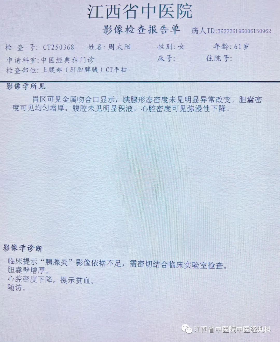2022年2月16日三诊:已无腹痛症状,上腹部CT回报影像无胰腺炎改变,后续回访腹痛未复发。