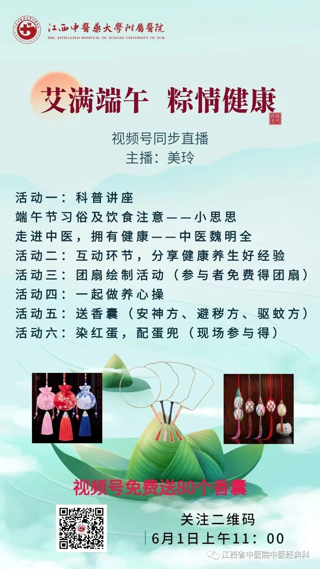 为弘扬传统文化,普及科学知识,促进国民健康,落实“我为群众办实事”及关爱患者,增进科室医患关系,增强科室凝聚力,在传统佳节端午节到来之际,中医经典科6月1日上午在病区开展“艾满端午,粽情健康”科普送健康活动,视频号同步直播。