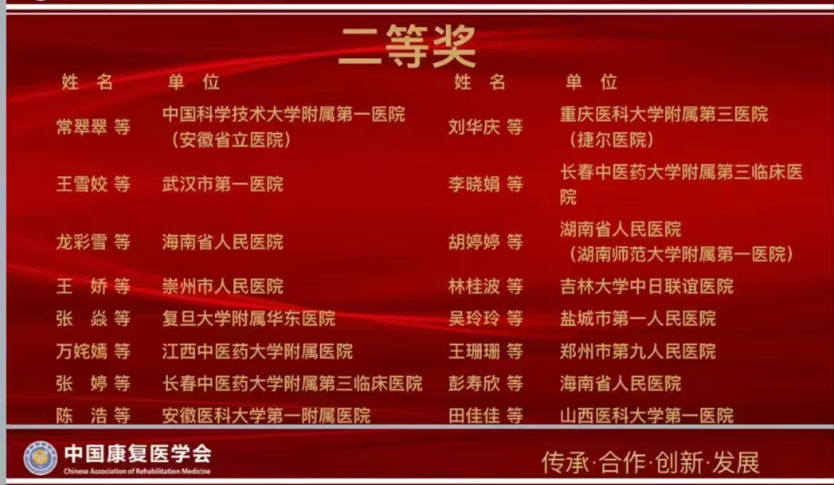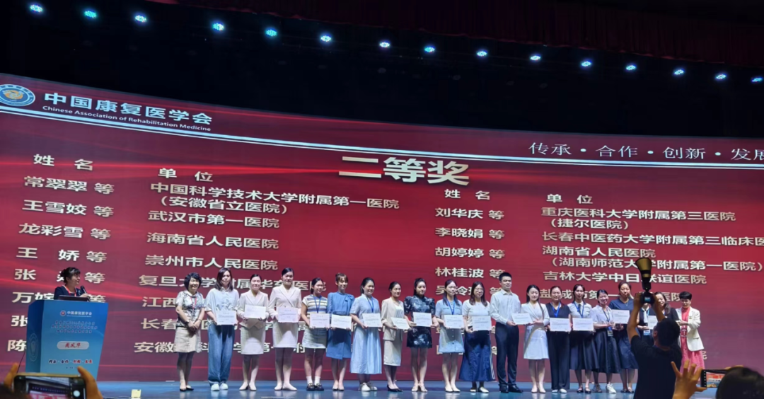 为促进康复护理领域学术交流,推广和普及康复护理的新理论、新方法、新技术,提高康复护理人员技术水平和服务能力,2024年8月22日至24日,中国康复护理专业委员会在陕西西安成功举办了以“传承·合作·创新·发展”为主题的学术年会及康复护理优质案例竞赛。康复二科万姹嫣、黄珍珠、郭邵邵组成的团队提交的《1例脑卒中后抑郁患者康复个案管理实践》案例,在众多参赛作品中脱颖而出,荣获2024年中国康复医学会康复护理专业委员会康复护理优质案例竞赛二等奖。