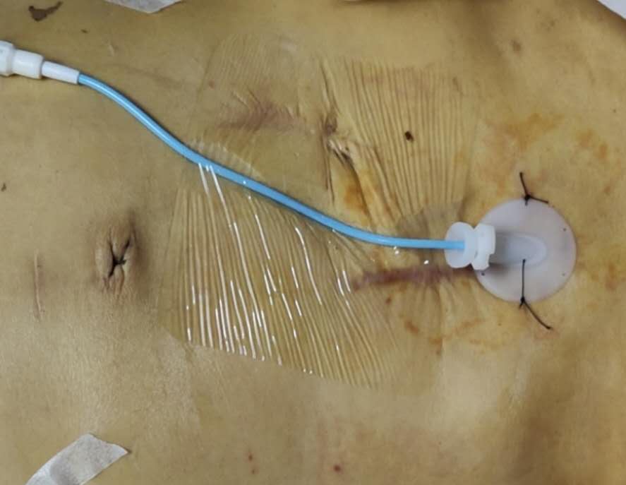 患者胃癌,肝门区转移瘤,导致阻塞性黄疸,如进一步恶化恐出现肝衰竭。于今日下午行PTCD术,希望能够为肿瘤治疗争取时机及延长患者生命。