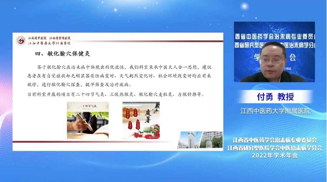 江西中医药大学附属医院付勇教授的报告题名为“江西盱江医学腧穴敏化理论在治未病中的应用”,付教授通过回顾盱江医学的沿革,以及盱江医学针灸学的发展,指出穴位敏化起源于近代盱江针灸学家魏稼的“动穴”概念,并发展为现在的腧穴“静息态”和“敏化态”,并进一步演化为力敏推拿,提出“辨敏取穴,择术以治”的精准推拿原则,以及该方法在治未病的广泛深入的应用。