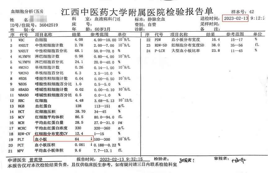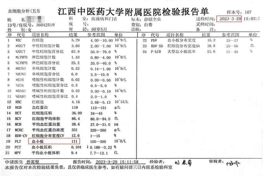 2022年11月3日,胡女士体检血常规发现血小板减少,血小板计数处于40~50*10^9/L之间,后于当地医院完善相关性检查排查除其他疾病导致的血小板减少,确诊为"原发性血小板减少症"。医院建议住院治疗,胡女士入院后经激素、艾灸、利可君片等对症治疗,最高血小板回升至90*10^9/L。但出院后不久,血小板又呈下降趋势,最低计数为20*10^9/L,胡女士以及家人对此十分担忧,胡女士甚至一度对治疗失去信心,好在家属没有放弃多方寻求,最后在朋友的推荐下,于2023年1月11日来到江西省中医院血液科曾英坚主任门诊求诊。