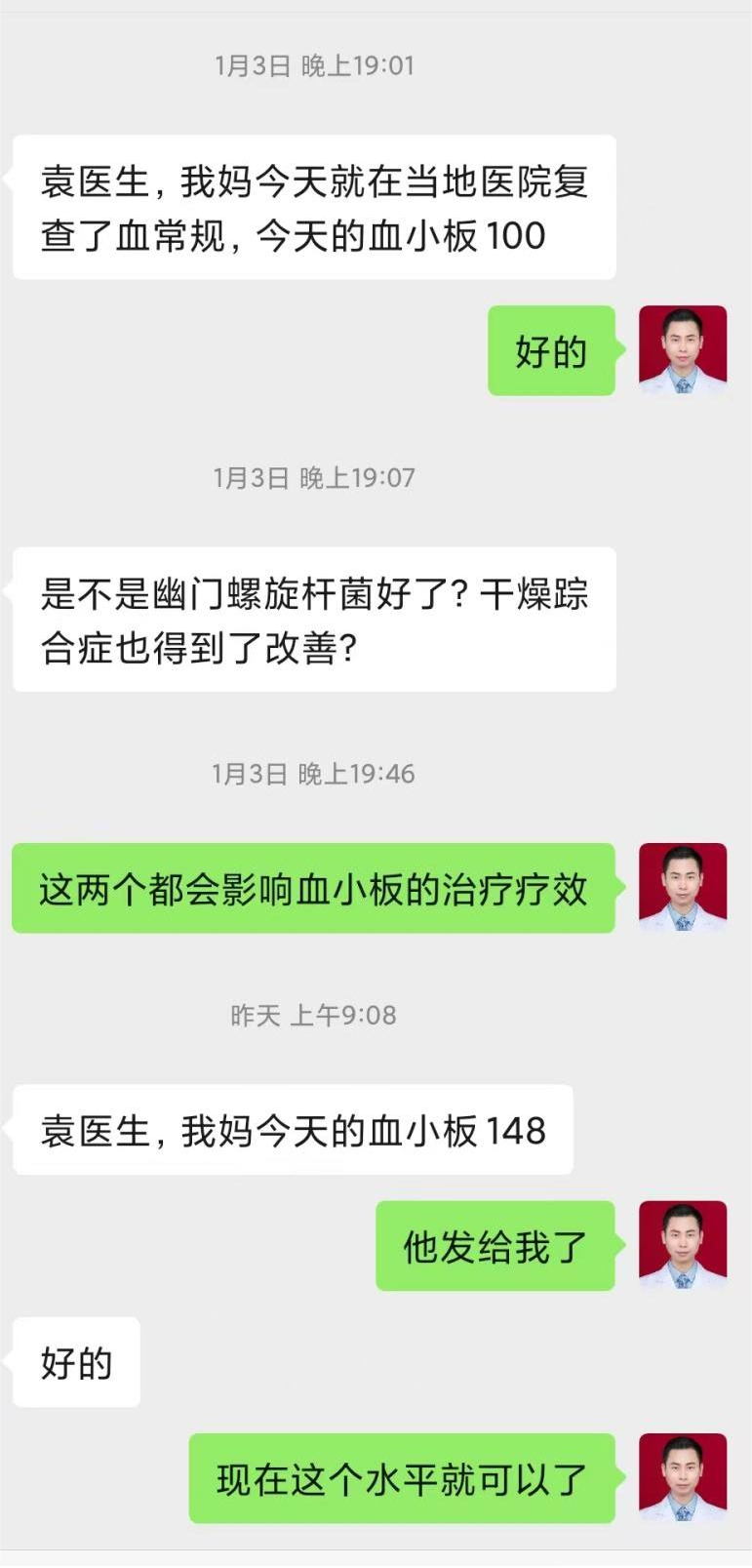 在辨明李大妈发病病机后,袁医生采用中西医融合技术为李大妈制定了个体化中西结合治疗方案,西医方面:调整为阿伐曲泊帕1片口服,每日1次升血小板,并联合治疗干燥综合征,抗幽门螺旋杆菌。中医方面:经四诊合参,辨病为“紫癜病”,辩证为燥热伤津证;是因燥热伤津,津枯血燥,燥邪郁久发热,热邪入血,破血妄行而发病,中医中药在柴胡木贼汤清热凉血止血加上玉竹、白芍、麦冬以滋阴润燥,血小板恢复后出院。出院后随访至今已1月,血小板计数正常,李大妈口干、咽干、自觉发热表现也已经消失;就在前不久1月16日复查血小板142*10^9/L,可喜可贺。
