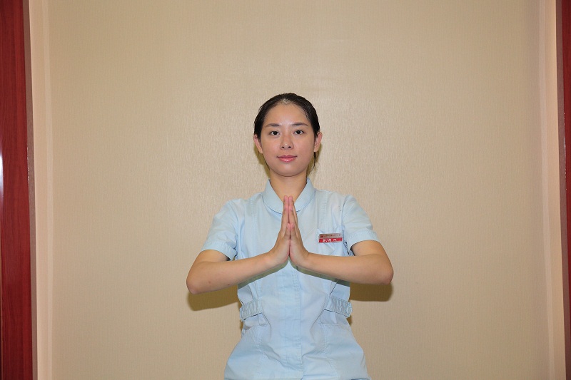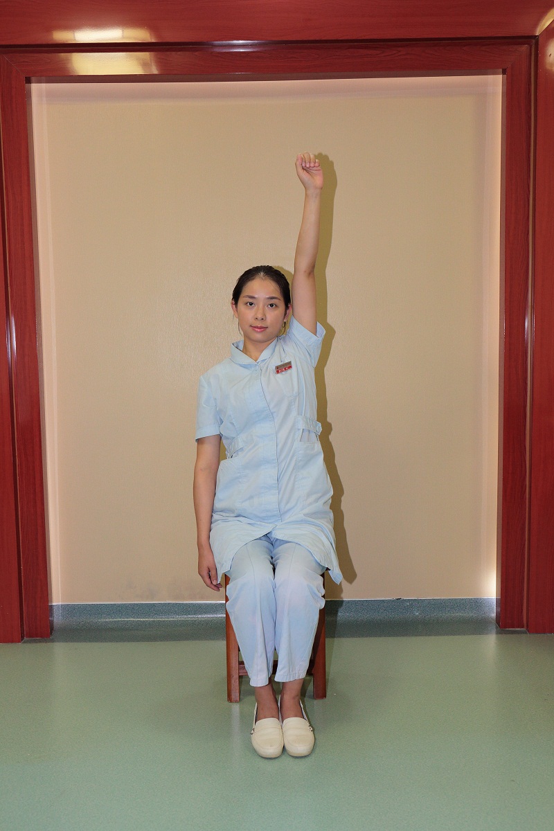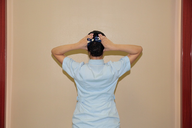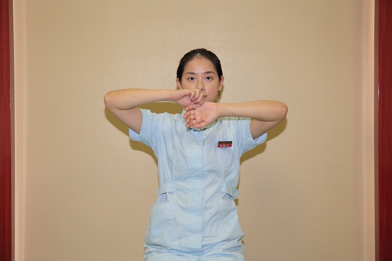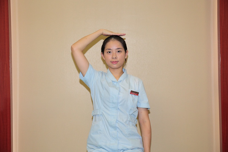 2、百会穴:先抬起右手用掌心拍打头顶顶端两个八拍,同法左手拍打两个八拍
