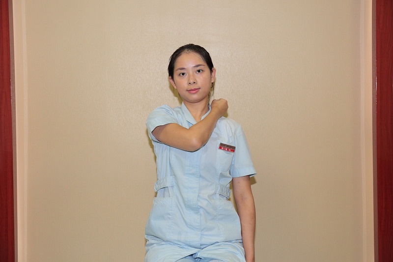 4、肩井肩髃:右手握拳拍打左侧乳头正上方与肩线交界处两个八拍,再拍打肩峰前下方凹陷处两个八拍,同法对侧