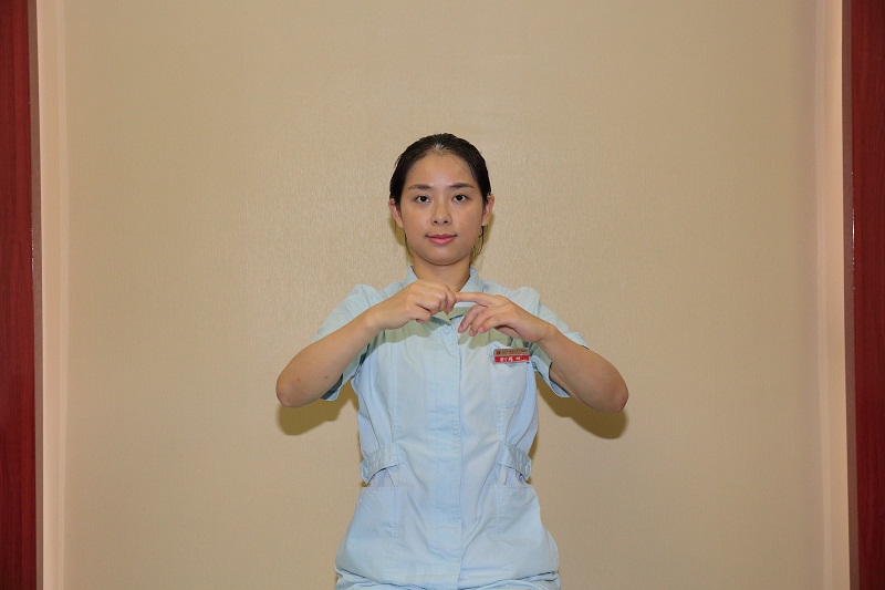 7、天突穴、膻中穴:右手握拳拍打胸骨上窝中央两八拍,再拍打两乳头中点两八拍,同法左手拍打。